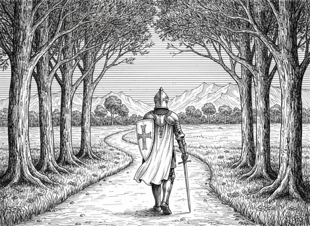With heavy shield and nimble sword, the pilgrim gallantly strides,